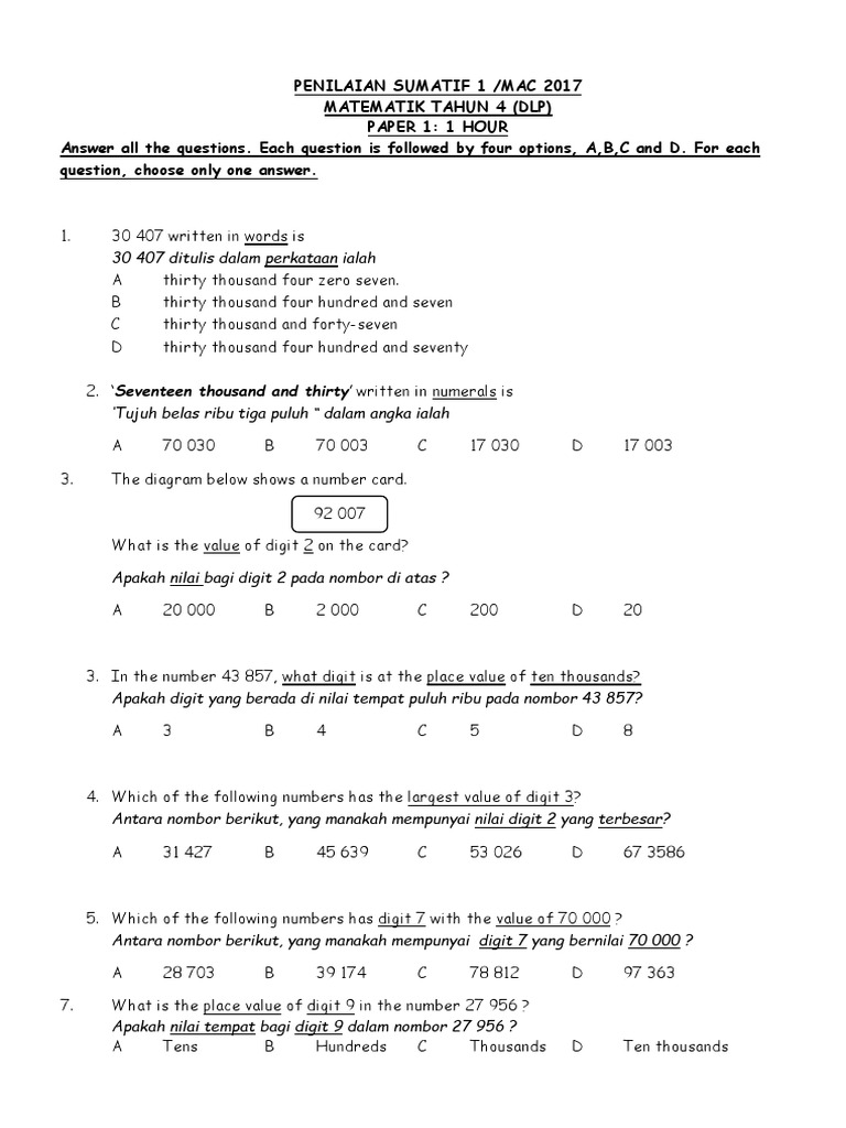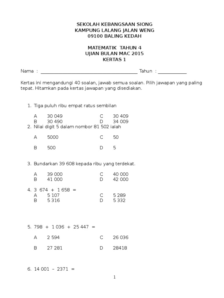 Soalan Kertas 1 Matematik Tahun 4 Mac 2015 Pdf